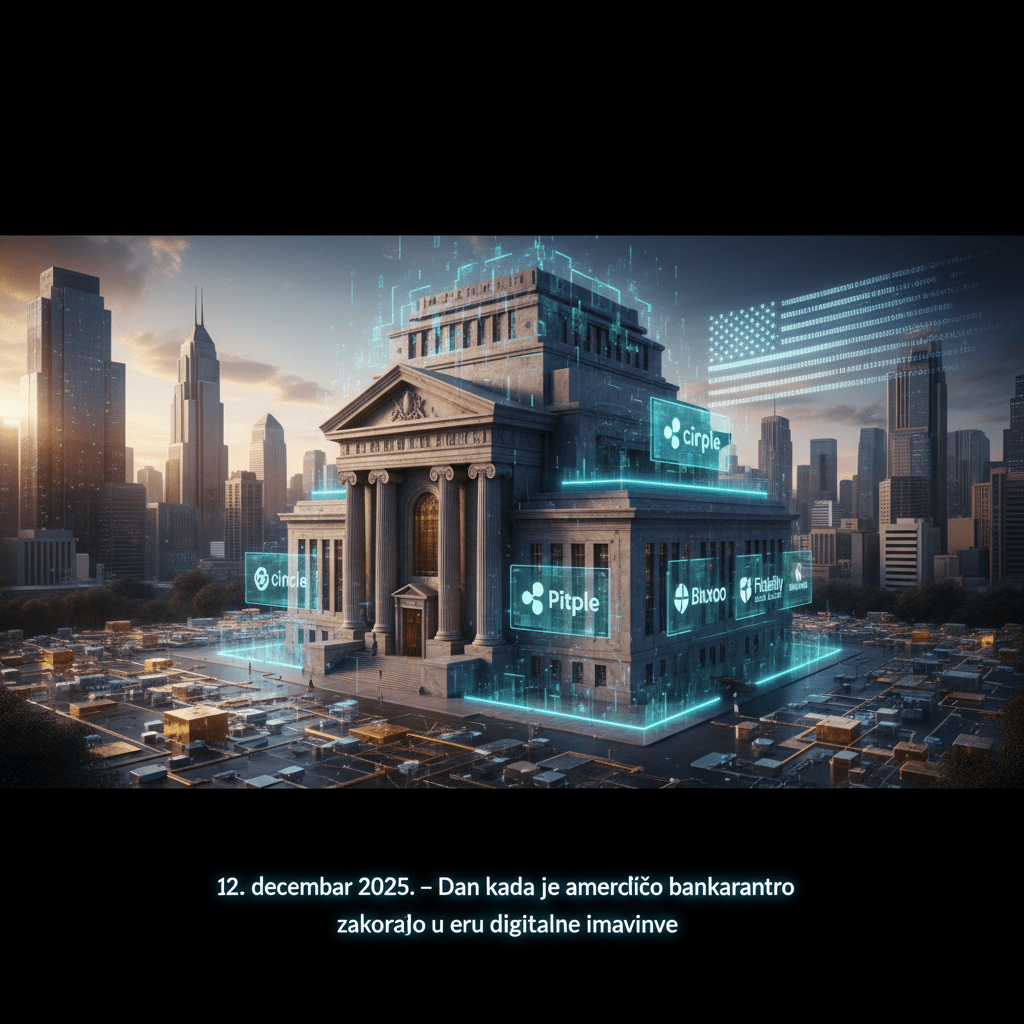 Datum 12. decembar 2025. mogao bi da ostane upamćen kao dan kada je američki bankarski sistem napravio veliki zaokret ka svetu digitalne imovine. Tada je OCC (Kancelarija kontrolora valute) — jedan od glavnih bankarskih regulatora u SAD — uslovno odobrio posebne bankarske dozvole za pet velikih kompanija iz oblasti kripta: Circle, Ripple, Paxos, BitGo i Fidelity Digital Assets.